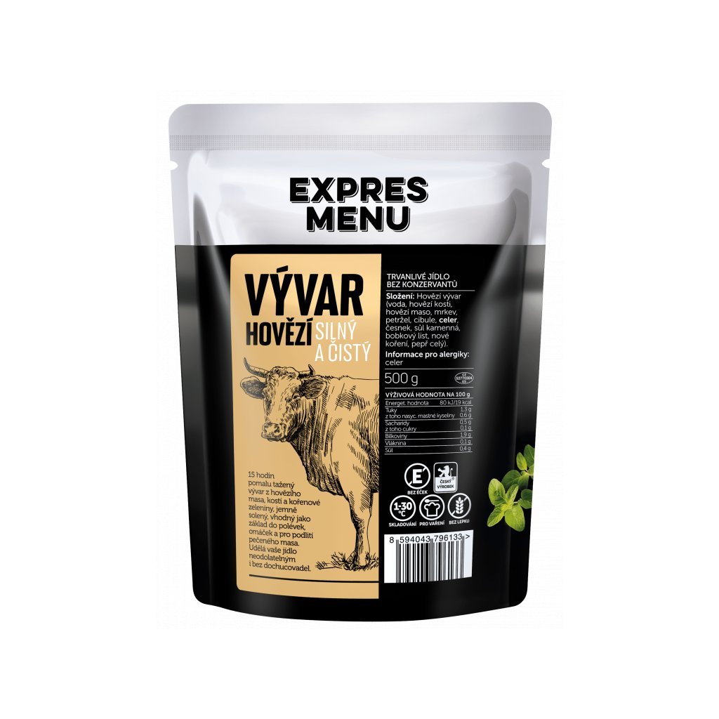 Hovězí vývar (voda, hovězí kosti, hovězí maso, mrkev, petržel, cibule, celer, česnek, sůl kamenná, bobkový list, nové koření, pepř celý).