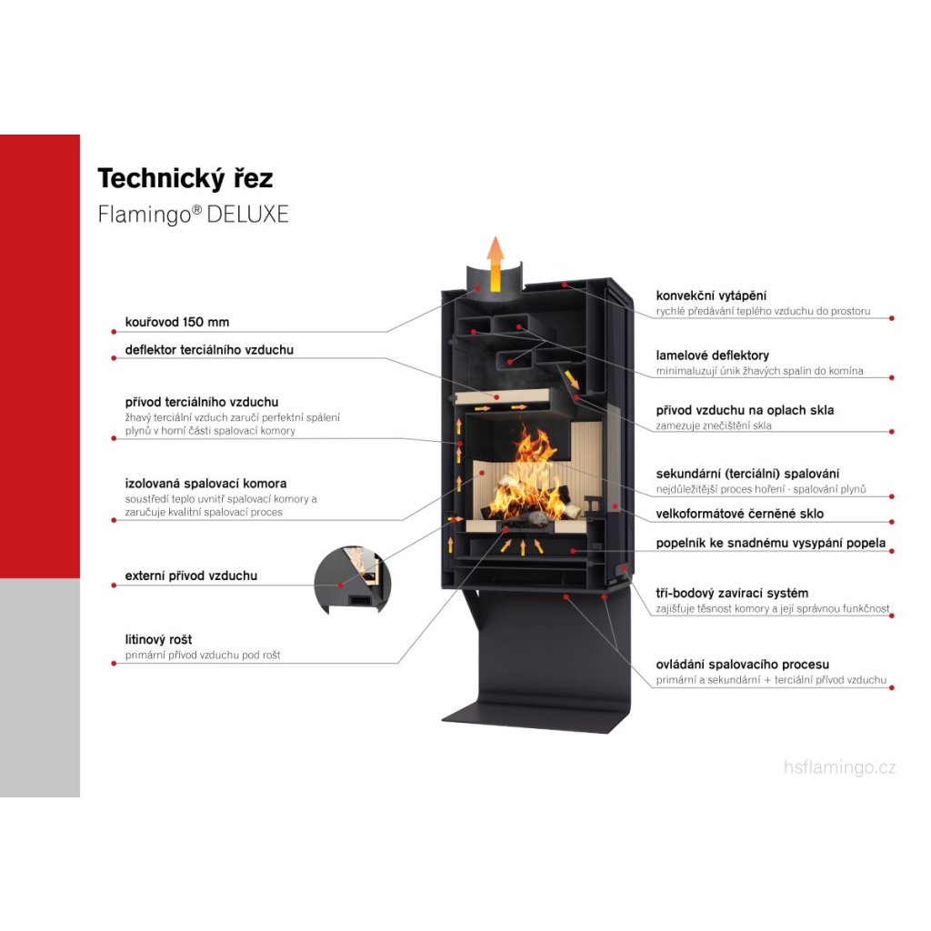 Systém spalování u kamen Flamingo DELUXE je dokonalost sama. Přísun vzduchu je zajištěn centrálně ze zadní části kamen. Množství popela je minimální. Celý spalovací proces je ovládán dvěma táhly, kdy první slouží k regulaci primárního vzduchu, potřebného k zatopení a rozhoření dřeva. Druhé táhlo slouží k podpoře sekundárního spalování, tedy spalování plynů. Jeho otevřením dochází k přísunu terciálního předehřátého vzduchu do horní části, který je vháněn do komory pomocí vrchního deflektoru. Tento vzduch se používá k úspornému a co nejefektivnějšímu průběhu hoření dřeva. Tímto je zajištěna vysoká účinnost a krásné hoření včetně čistého skla. K zajištění správného spalování je zapotřebí správný tah komína, který docílíte umístěním regulátoru na kouřovod nebo komínovou branku.