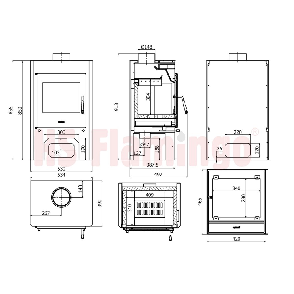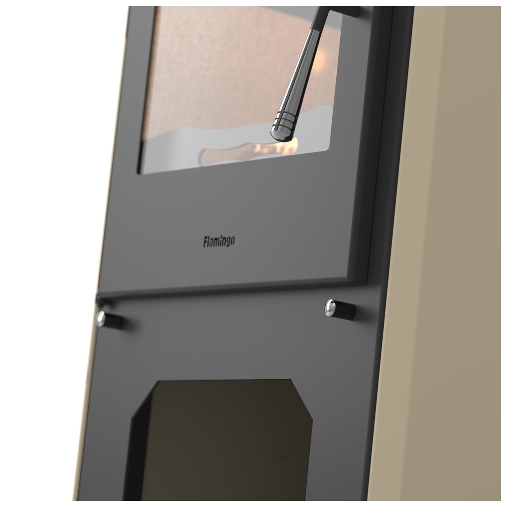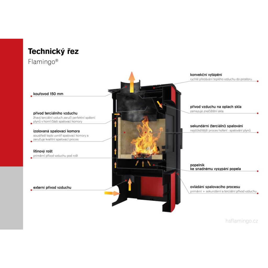 Komora je konstruovaná tak, aby byla dosažena vysoká účinnost a malá spotřeba paliva, která činí průměrně 2,5 kg na hodinu. Spalovací komora je vyrobená ze silného ocelového plechu a pro dokonalejší spalování je vysázena pravým šamotem. Sekundární spalování, krásně čisté sklo a externí přívod vzduchu je u kamen Flamingo samozřejmostí. Kamna jsou vyrobená z kvalitních materiálů a díky tomu Vám můžeme poskytnout záruku 5 let.