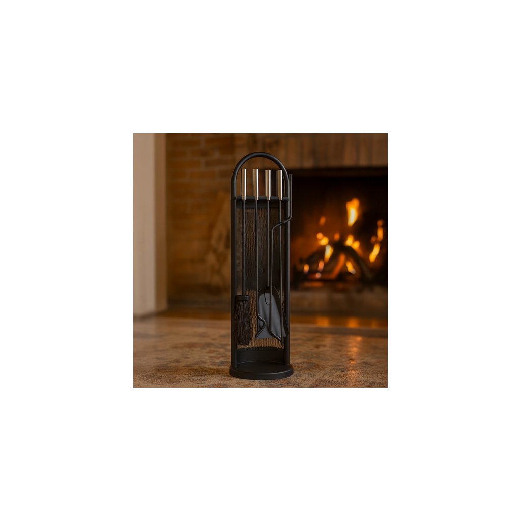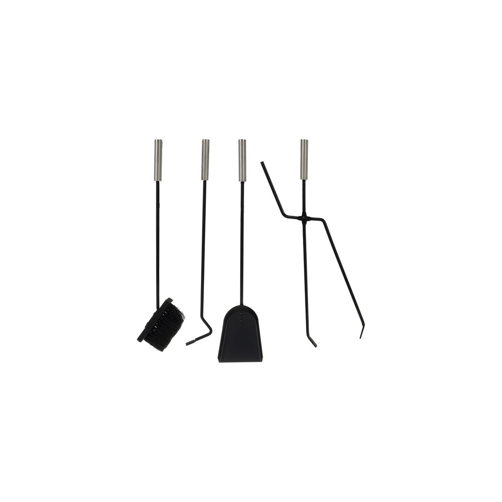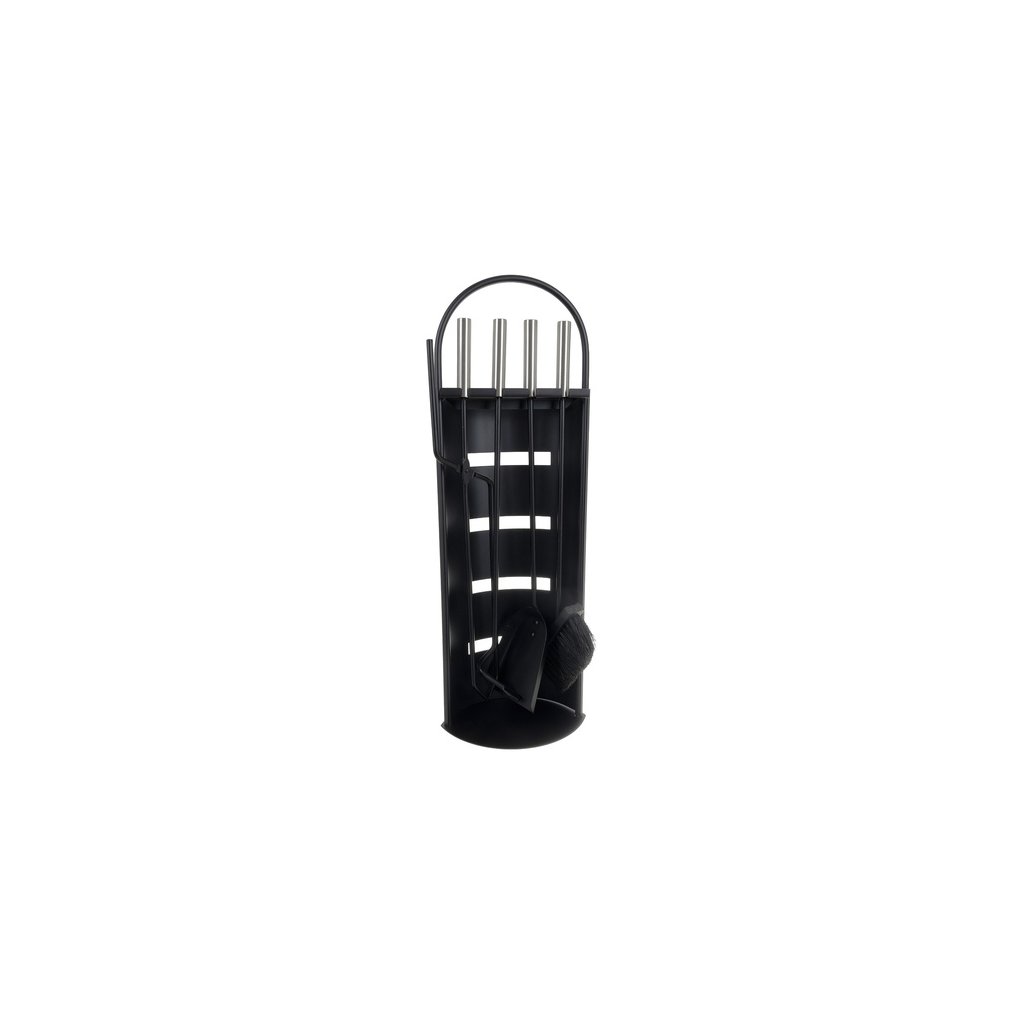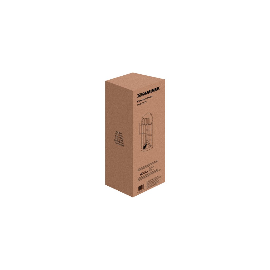 Elegantní a odolná sada krbového nářadí KAMINER 25971 obsahuje vše potřebné pro obsluhu krbů, kamen i venkovních ohnišť. Pětidílný set (kleště, lopatka, smetáček, pohrabáč a stojan) je vyroben z oceli a nerezové oceli, odolává vysokým teplotám a díky kovovým rukojetím a stojanu s háčky zajišťuje bezpečnou manipulaci i přehledné uložení nástrojů.