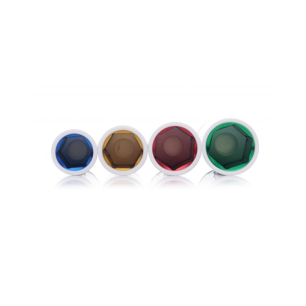 Špičky čepic s chromovaným povrchem v různých barvách pro snadnou identifikaci velikosti