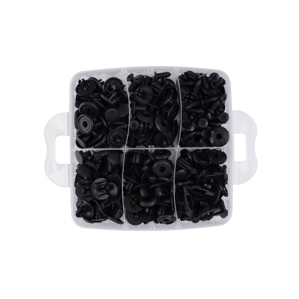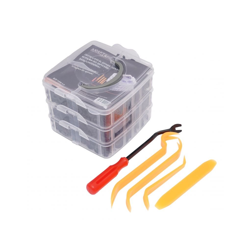 Sada spon a klipů KD10612 od značky Kraft&Dele je ideálním řešením pro opravy a montáž čalounění v automobilech. Obsahuje 630 ks různých spon, klipů a montážních nástrojů, které pokrývají nejběžnější velikosti používané v automobilovém průmyslu.