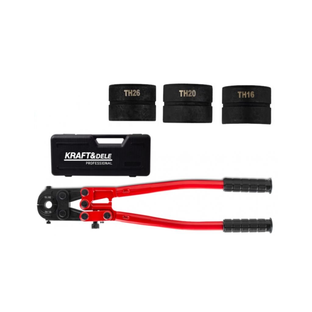 Kraft&Dele KD10636 krimpovací kleště na trubkyUniverzální lis na trubky PEX TH16, TH20, TH26 s kufříkem značky Kraft&Dele model KD10636 je určen pro práci s trubkami PEX TH16, TH20, TH26. Nezbytný nástroj pro každého instalatéra nebo instalatéra topení.