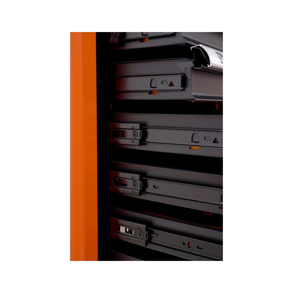Vozík má sedm zásuvek (6 naplněných nářadím)