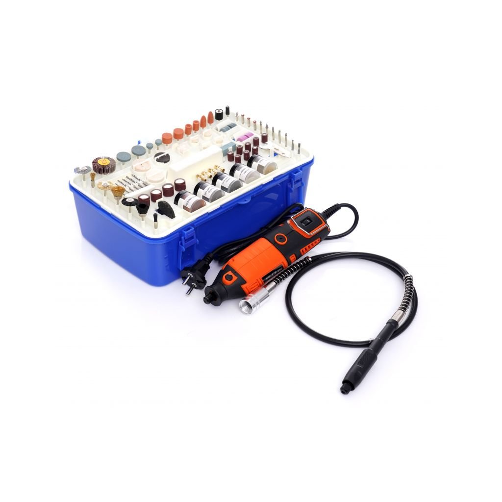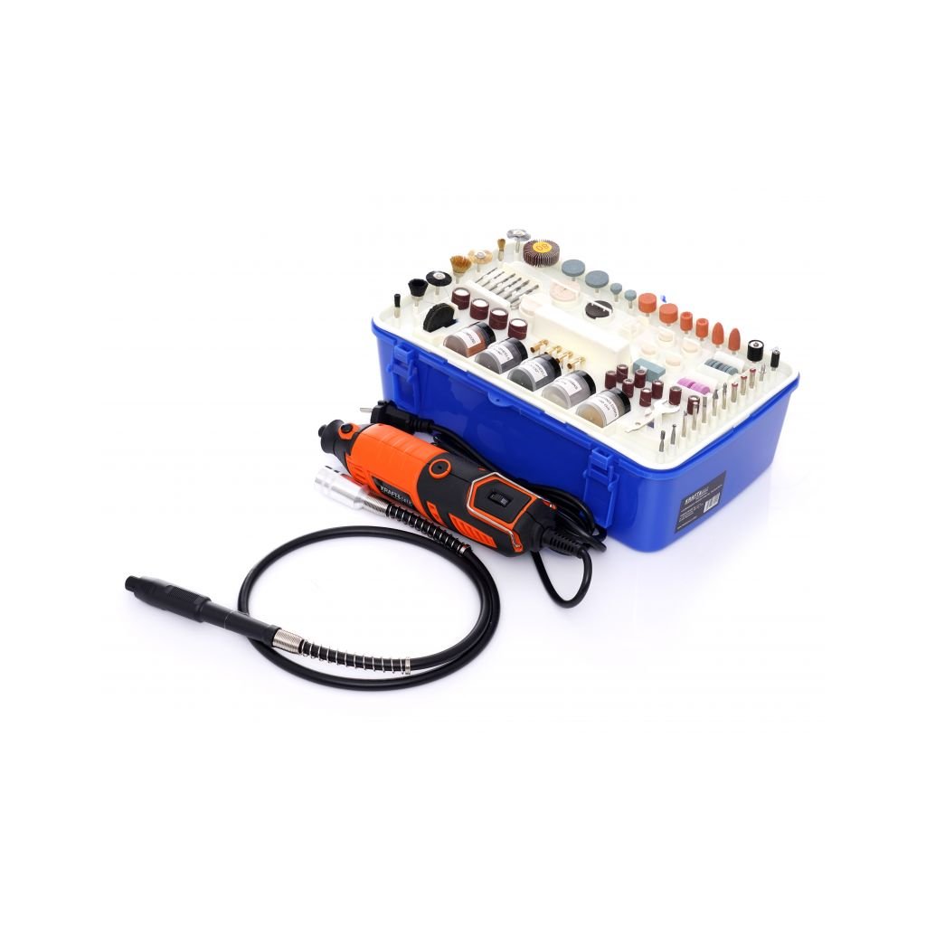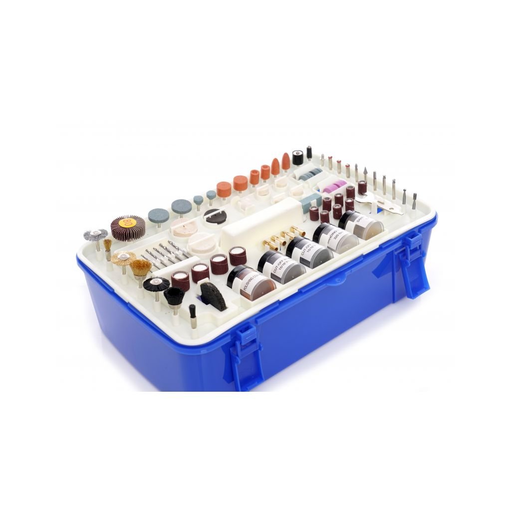 - 218 kusů příslušenství (gravírovací řezačka, redukce klínových kamenů, dláta, plsti, disky, vrtáky, kartáče ...)