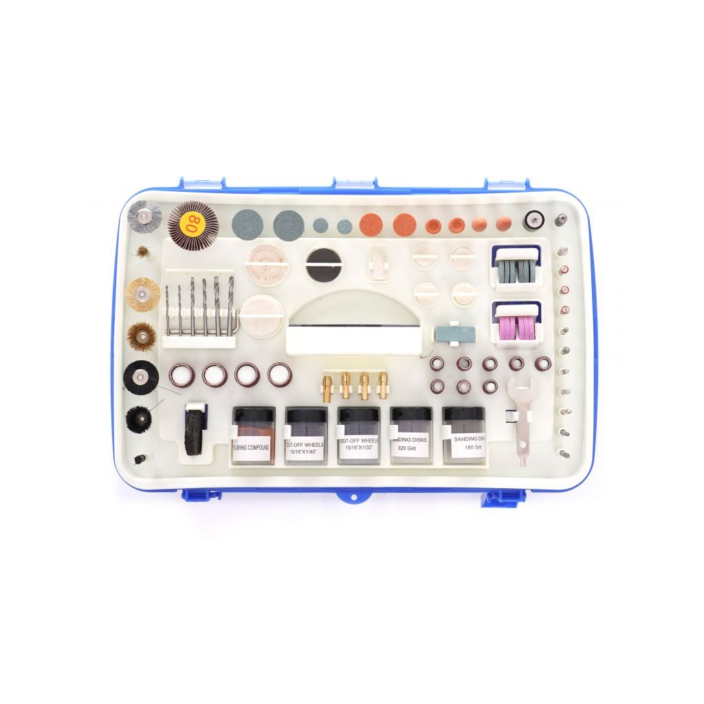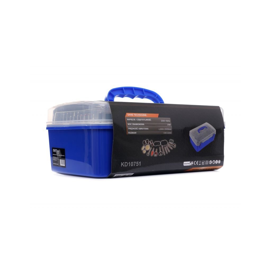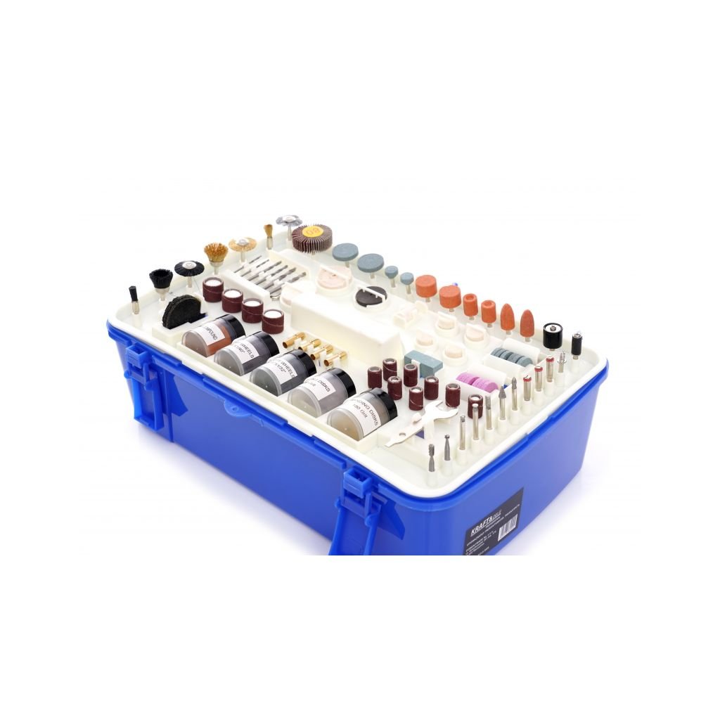 - 218 kusů příslušenství (gravírovací řezačka, redukce klínových kamenů, dláta, plsti, disky, vrtáky, kartáče ...)