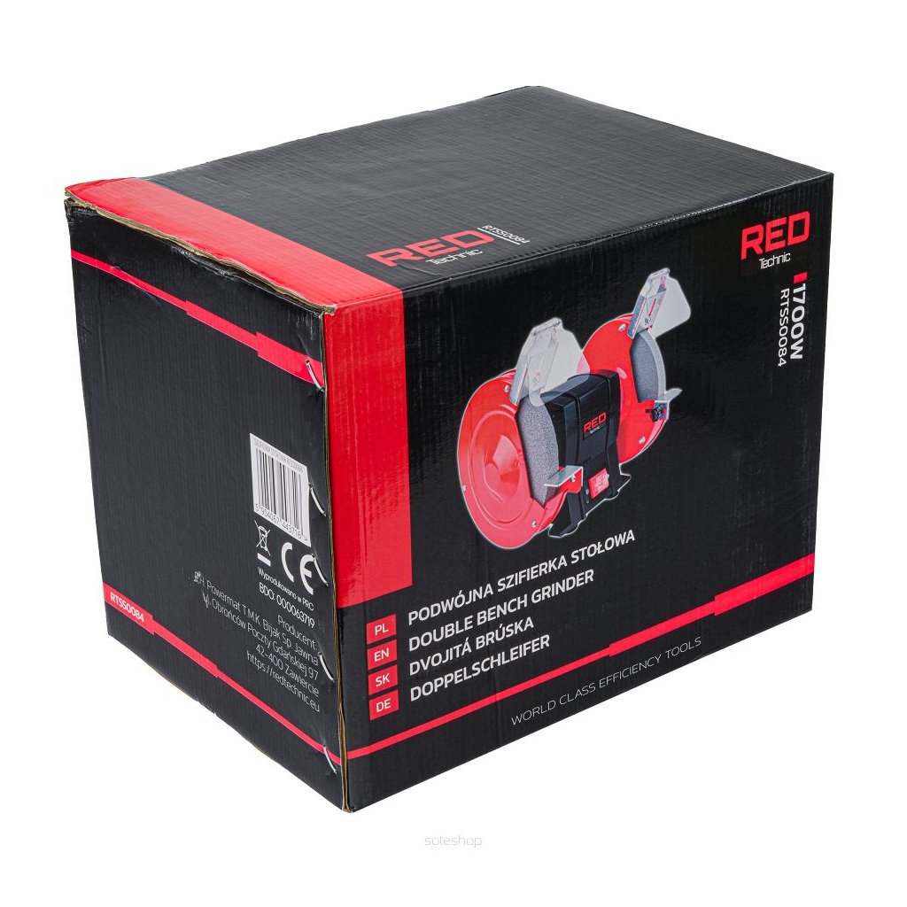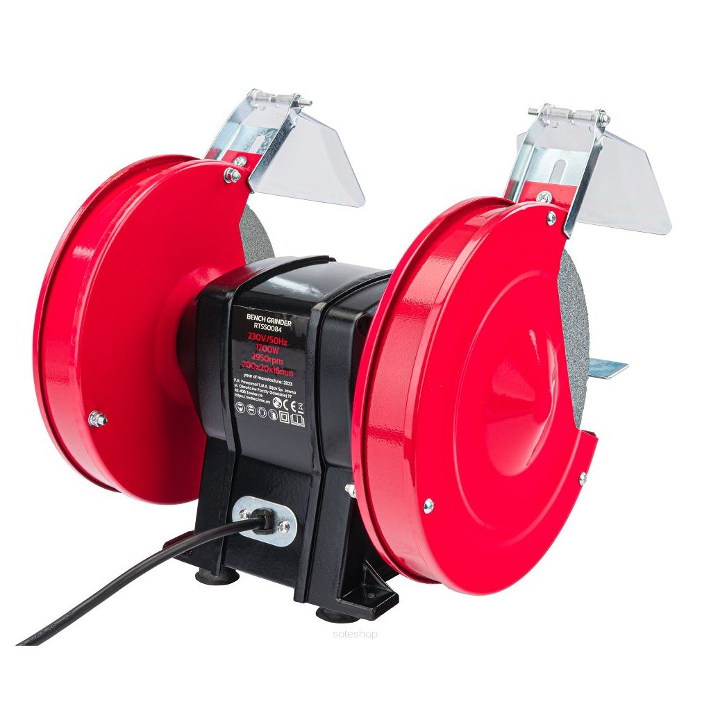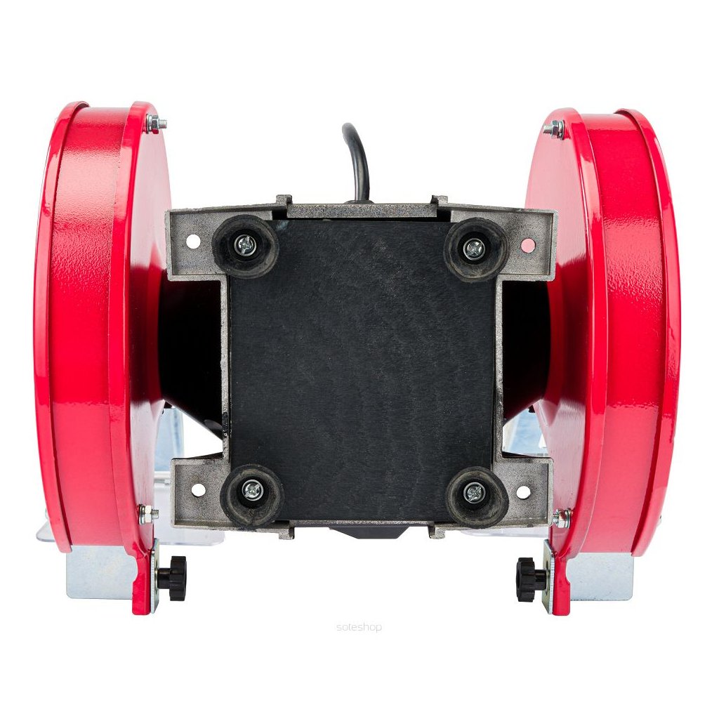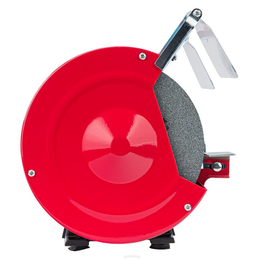 Bruska je vybavena kovovým pouzdrem, nastavitelnými nástavci, kryty ochrany proti jiskrám.