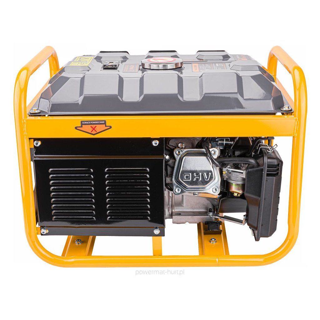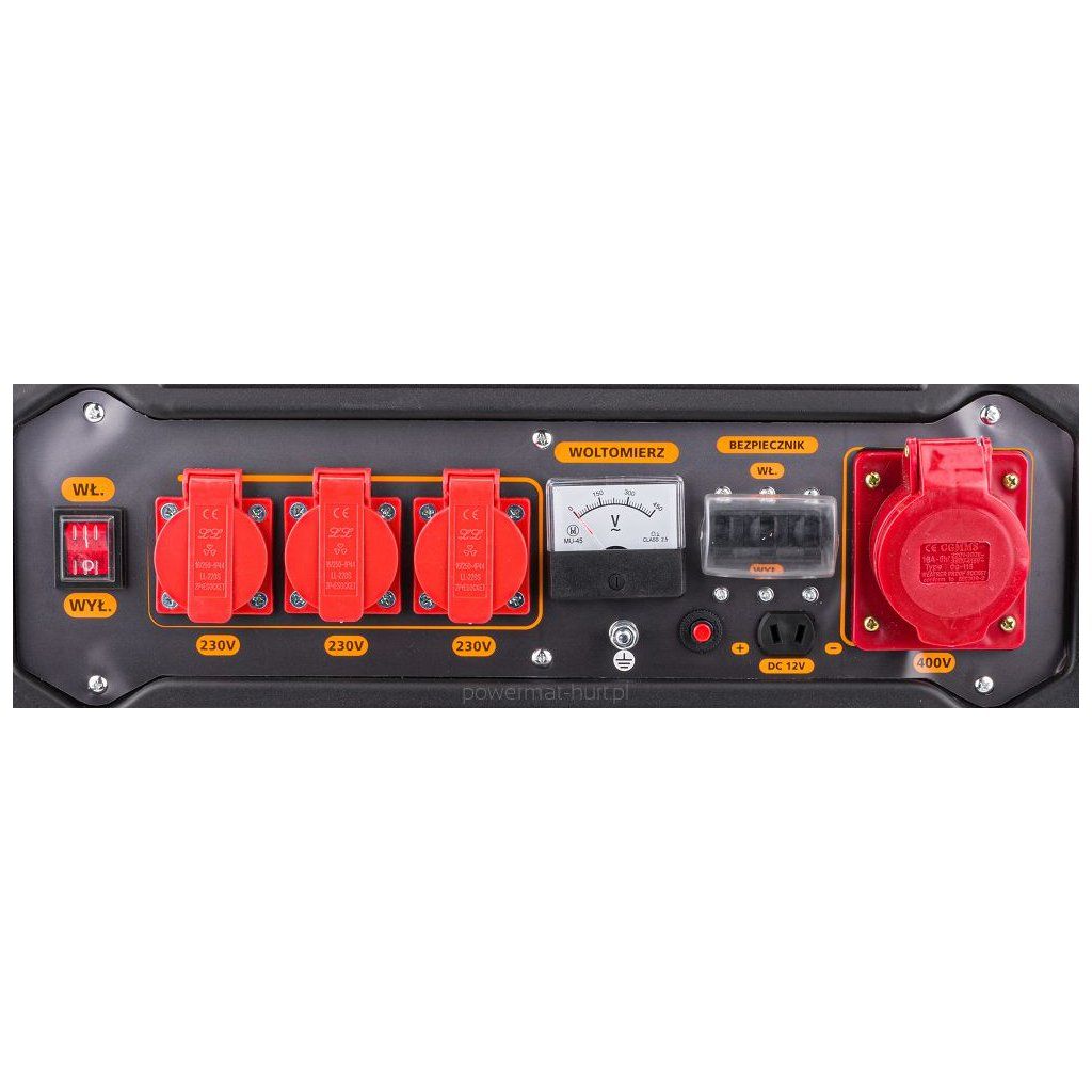 Generátor generuje střídavý proud s napětím 230 V (3 zásuvky), 400 V (1 zásuvka) a stejnosměrným proudem 12 V (1 zásuvka). Perfektní řešení pro nedostatek elektřiny v terénu. Vybaveno voltmetrem a pojistkami. Generátor má snímač hladiny oleje, který automaticky vypne motor, pokud je jeho hladina příliš nízká. Spouštění generátoru - ručně - kabelem. Jednotka používaná v řemeslech, stavbách na pozemcích a zahradách pro práci s elektrickým nářadím, čerpadly, osvětlením.