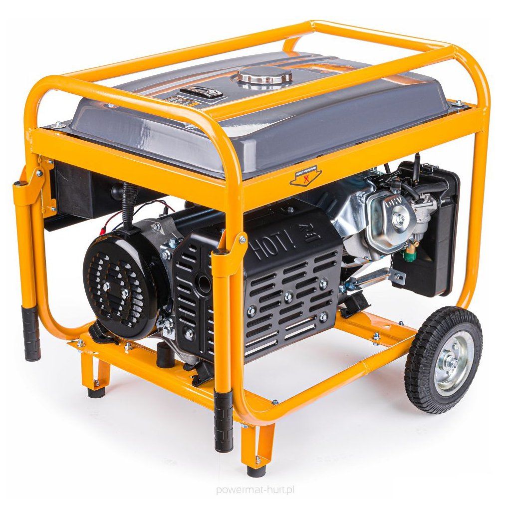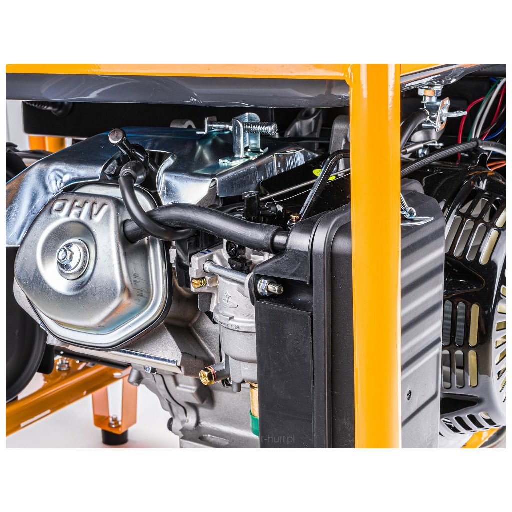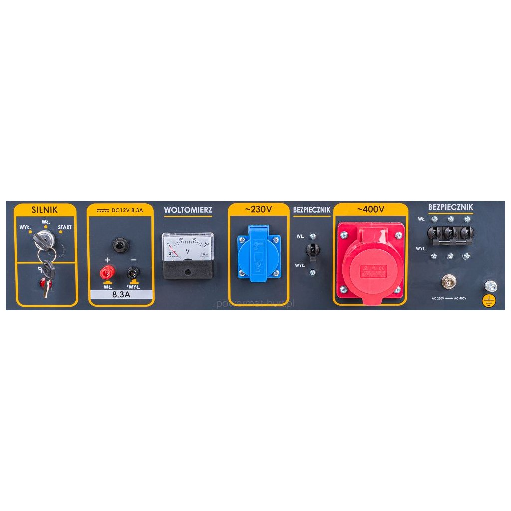 Generátor generuje elektrický proud s napětím 230 V (1 zásuvka) a 400 V (1 zásuvka). Perfektní řešení pro nedostatek elektřiny v terénu. Vybaveno voltmetrem a pojistkami. Generátor má snímač hladiny oleje, který automaticky vypne motor, pokud je jeho hladina příliš nízká. Spouštění generátoru - elektrického (klíčem) a ručně - kabelem. Jednotka používaná v řemeslech, stavbách na pozemcích a zahradách pro práci s elektrickým nářadím, čerpadly, osvětlením.