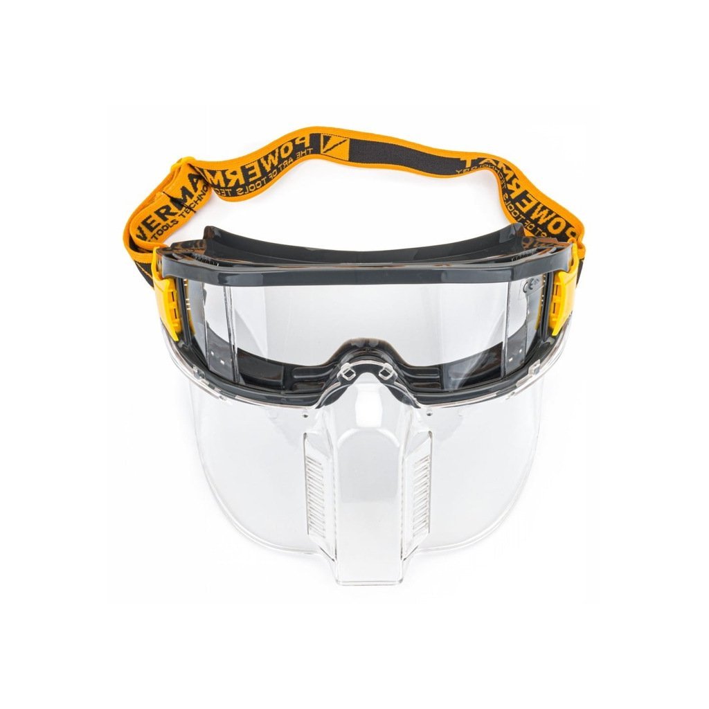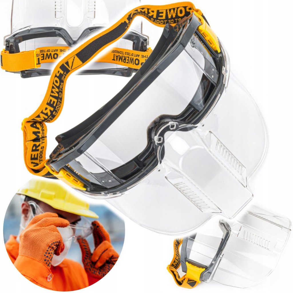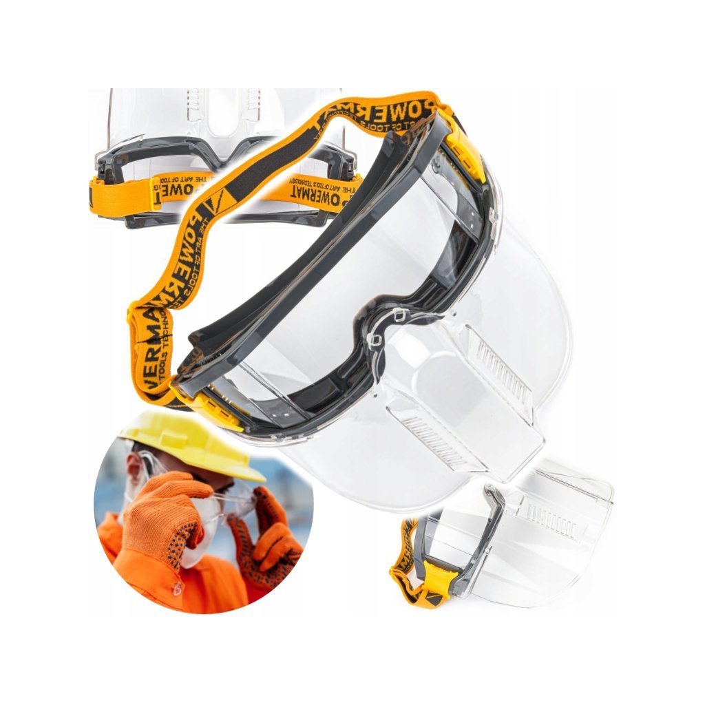 Ochranné brýle s vestavěnou maskou POWERMAT PM-GO-OG4 poskytují vysokou úroveň ochrany očí a obličeje proti mechanickým částicím, prachu, chemikáliím a postříkání. Jsou ideální pro stavební práce, řezání, broušení, vrtání a práci s chemickými látkami.