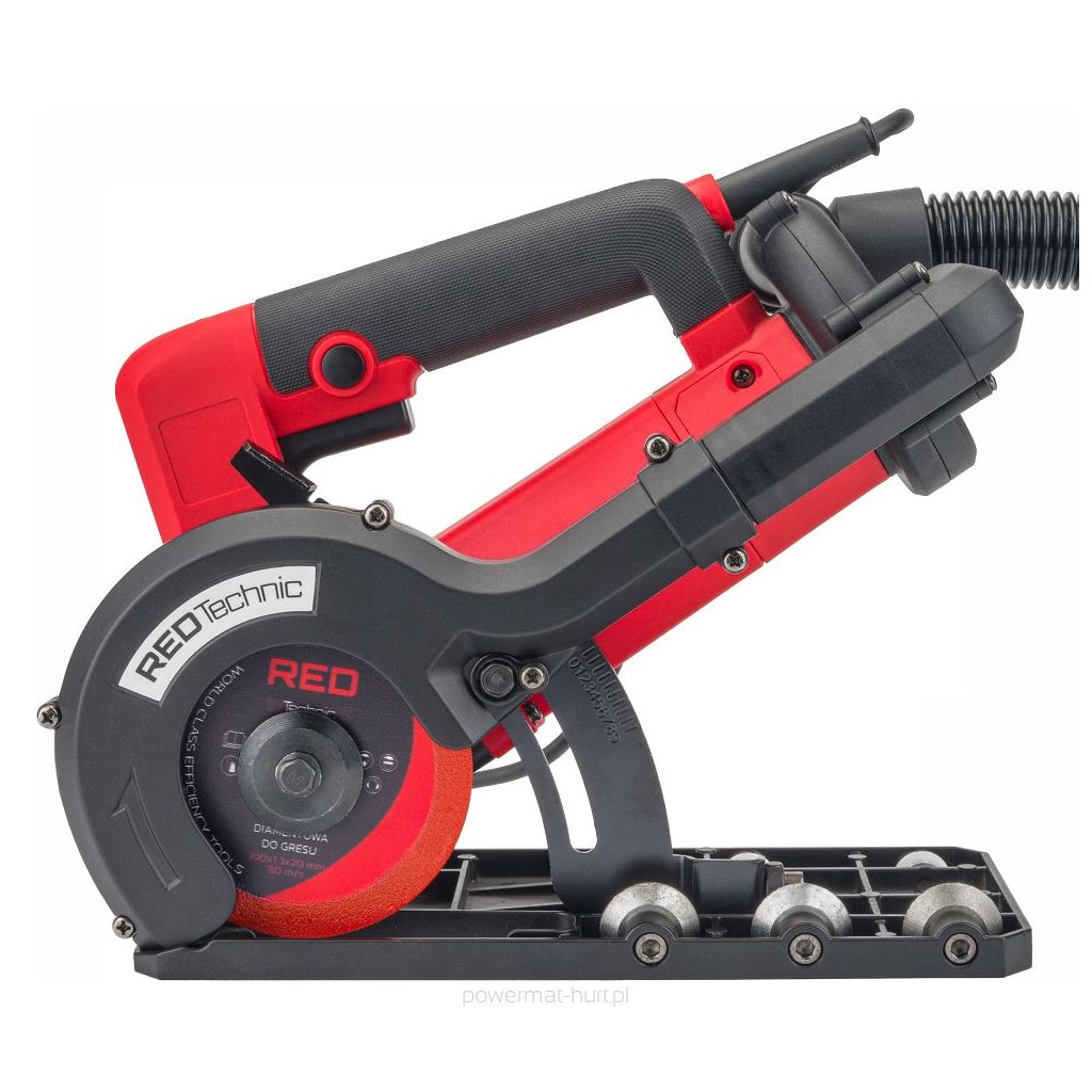- Rovnoměrný vodicí systém přes mezery - pro usnadnění práce je řezačka/bruska vybavena ostrými vodicími válečky, které po zaboření do spárovací mezery umožňují snadné vedení zařízení v přímé linii.