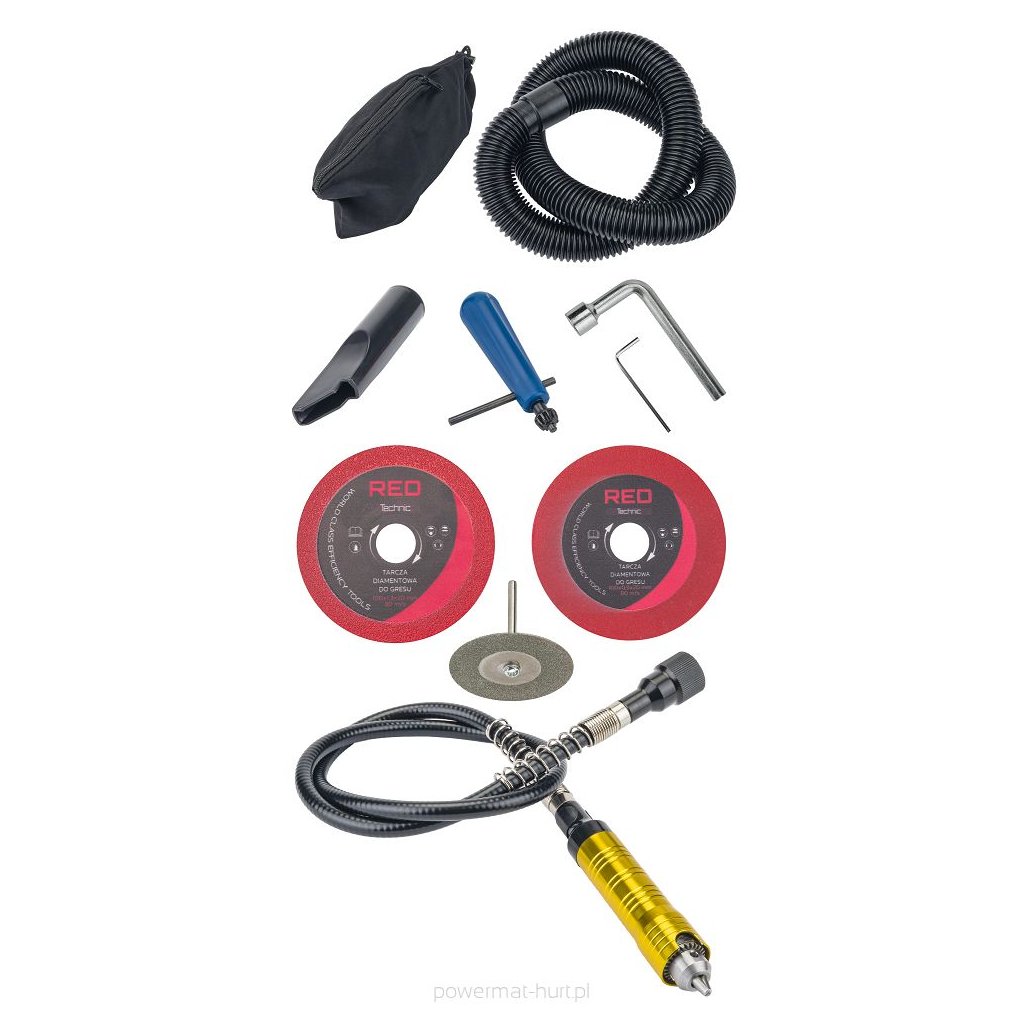 - Minibruska je vybavena ohebnou hřídelí s možností připevnění kamenů nebo brusných kotoučů pro broušení nebo řezání zbytků spárovací hmoty na těžko přístupných místech.