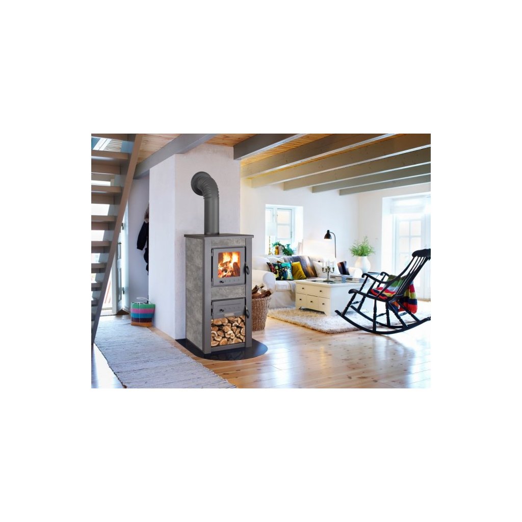 ALPINA BOILER 30 jsou multifunkční a zároveň efektivní pro vytápění prostor. Pokud hledáte kamna, která by účinně vytápěla váš velký dům (100-120 m2), pak je ALPINA BOILER 30 tím pravým doplňkem. Boiler pojme až 34 litrů. Jako palivo pro tato kamna můžete použít suché dřevo (maximální obsah vlhkosti do 20 %), dřevěné brikety, dřevěné uhlí a uhelné brikety. Při spalování v tomto sporáku vzniká horká voda, která se přivádí do radiátorů, a nebo panelů pro podlahové vytápění. Kamna ALPINA BOILER 30 lze snadno připojit ke stávajícímu systému ústředního vytápění. Optimální tah komína v Pascalech je 12,5. Z celkových 30 kW jde cca 24 kW do systému. Existuje možnost instalace automatického regulátoru tahu. Tato kamna mají vysokou účinnost 83 %. Pokud si vyberete kamna pro vytápění vašeho domu, dosáhnete výrazných úspor nákladů na vytápění a zároveň budete využívat obnovitelné zdroje energie. Tato kamna jsou také ekologická. Jsou vyrobena z ocelového plechu kotle, odolného vůči vysokým teplotám. Tloušťka oceli je 4-5 mm a průměr přípojných trubek je od 1 i 3/4. Boky kamen jsou pokryty dekorativními dlaždicemi nejvyšší kvality, které navíc zachovávají a poskytují rozšířené teplo a záření. V případě jakéhokoli mechanického poškození lze podle pokynů výrobce keramiku snadno vyměnit. Kamna ALPINA BOILER 30 mají velký spalovací prostor, kam můžete umístit polena či dřevěné brikety o délce 30-40 cm a obvodu 30-35 cm. Pod spalovacím místem je prostor určený pro skladování paliva. Dveře topeniště jsou ze speciálního skla, které je odolné vůči vysokým teplotám (až 850 °C), a které umožňuje pohled na oheň a dodává tak příjemnou atmosféru vaší domácnosti. ALPINA BOILER 30 splňuje normu CE, což znamená, že je v souladu s nejpřísnějšími předpisy EU o bezpečnosti a energetické účinnosti.