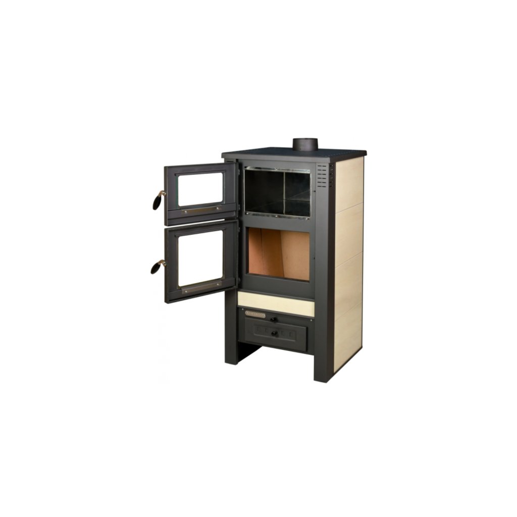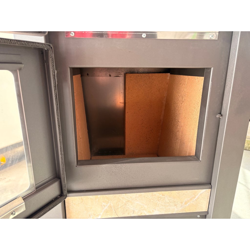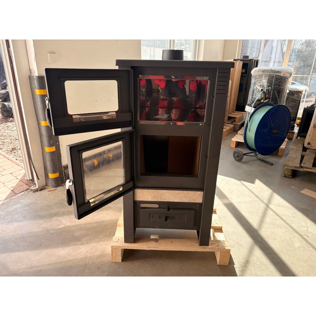Součástí je i praktická samostatná nádoba na popel pro snadné vyprazdňování zbytků po spalování. Prostorná spalovací komora umožňuje vložit polena o délce cca 45 cm. Oddělený přívod primárního a sekundárního vzduchu zajišťuje optimální energetický výnos. Kamna jsou pečlivě utěsněna. Pec lze velmi rychle zahřát na provozní teplotu.