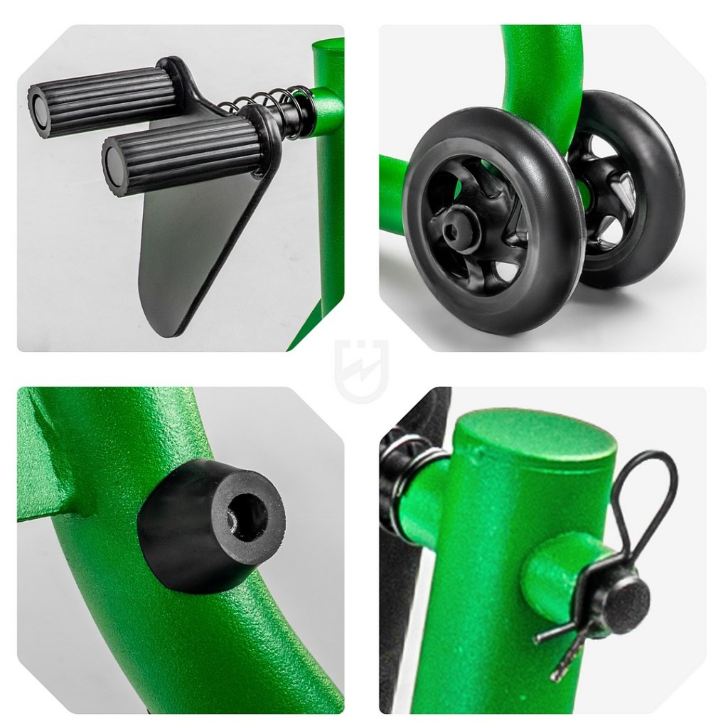 Solidní přední motocyklový stojan s nosností 170 kg, určený pro bezpečný servis brzd, výměnu pneumatik i zimní uskladnění. Vyztužené ocelové trubky o průměru 32 mm zajišťují vysokou tuhost a stabilitu bez nežádoucího kymácení. Systém dvojitých pojezdových kol umožňuje plynulé nadzvednutí bez nadměrné síly, speciálně tvarované rameno drží bezpečný odstup od blatníku a kapotáže. Gumované držáky pod holeně přední vidlice chrání povrch před poškrábáním. Povrchová úprava je práškově lakovaná, odolná vůči korozi i dílenské chemii.